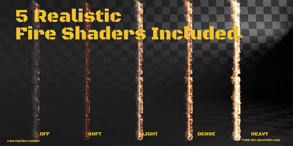 • Shader Presets: Included are 8 custom shader presets, compatible with both Cycles and Eevee. These presets include 5 realistic and 3 stylized fire shaders, offering you the flexibility to customize your effects effortlessly, whether you’re aiming for a hyper-realistic fire or a more artistic approach.